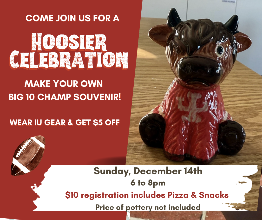 Come join us as we celebrate IU winning the Big 10 Championship! Lots of football and bison themed pottery to choose from! $10 includes 2 slices of pizza for adults and light refreshments, $7 for youth includes 1 slice and they get a $3 credit. This does not cover the price of pottery but if you wear IU gear you do get $5 off.