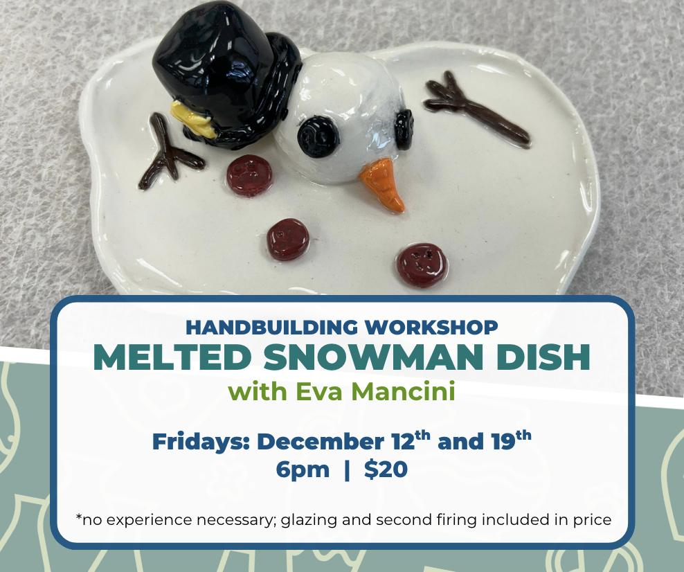 Create your own melted snowman dish in this step by step workshop with Eva Mancini. $20 covers the price of the dish, instruction and glazing.