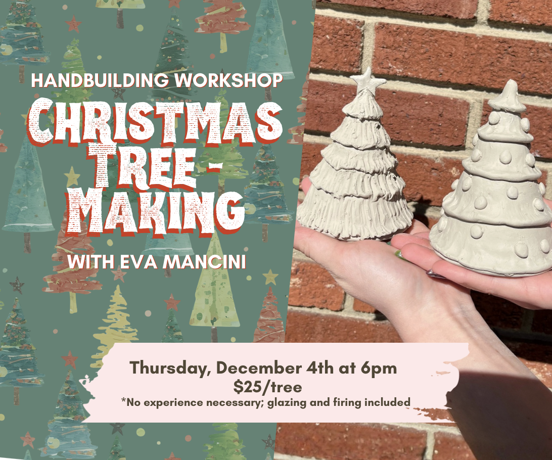 Make your own Christmas Tree out of clay with Eva Mancini. No experience necessary! Tree will be ready to be painted with glaze in 2 weeks. Includes all materials and firings. We cannot guarantee that they will be ready in time for Christmas but we will do our best! We are certain you will enjoy them for years to come.